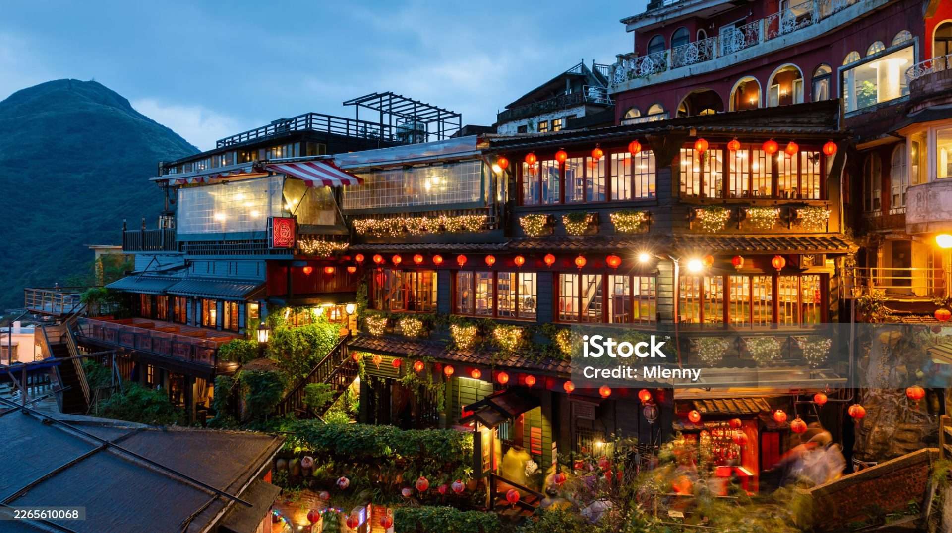Traditional Teahouses illuminated by red lanterns in the historic hillside village of Jiufen in Taiwan at Dusk. The atmospheric street scene overlooks the mountains and is a famous travel destination in Northern Taiwan. A-Mei Tea House, Jioufen Old Street, Ruifang District, New Taipei City, Taiwan, East Asia.